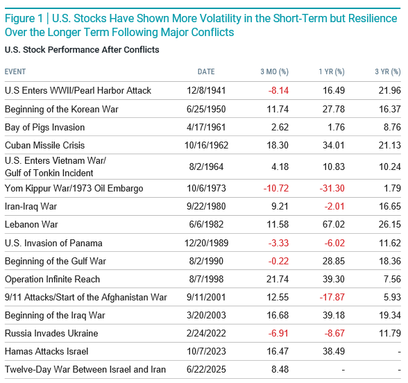 When examining major global conflicts dating back to the 1920s, markets often experienced higher short term volatility after the start of a conflict. However, the longer-term outcomes were much more encouraging. In fact, across the events studied, stock market returns three years after the start of these conflicts were positive in every case examined, highlighting the resilience of markets and the importance of staying invested.